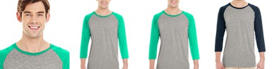 4.5 oz., 50% polyester, 37% cotton, 13% rayon preshrunk jersey; Soft, lightweight jersey with moisture wicking properties; Made with sustainably sourced USA grown cotton; Contrast collar and three-quarter raglan sleeves; Seamless 1x1 rib collar with two-needle coverstitching around neck; Tear away label; Side-seamed; Two-needle hemmed sleeves and bottom; Jerzees styles are manufactured using sustainable protocols which are measured and reported annually by Fruit of the Loom, Inc.; Jerzees styles are manufactured with the commitment to enriching lives for people and communities which is measured and reported annually by Fruit of the Loom, Inc.;