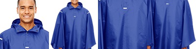 1.7 oz/yd2 / 58 gsm, 100% polyester taffeta with water-resistant finish; Encased elastic at hood opening for superior weather protection; Reflective tape details at front and back shoulders and placket; Two-snap closure at placket with dyed-to-match plastic snaps; Packable into self back pocket with hook and loop closure; Shockcord at lower hem for added weather protection;