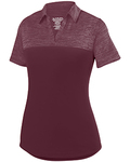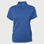 100% polyester heathered wicking knit top body, collar and sleeves ; 100% polyester wicking knit solid bottom body ; Wicks moisture away from the body ; Ladies' fit ; Pad print label ; Contrast self-fabric Johnny collar, placket, and yoke ; Contrast set-in sleeves ;