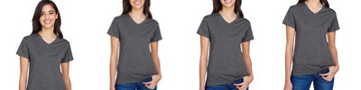 100% polyester heather tee, 4.2 oz. per square yard; Moisture management for all season comfort; Odor resistant and stain release fabric for easy care; Double needle cover-stitch hem; Reinforced shoulder seam; Tag free v-neck;
