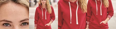 50% polyester, 50% cotton jersey knit; New fit for greater comfort; Contrast color 1x1 rib-knit collar; Contrast color rib-knit collar and raglan sleeves; Double-needle hemmed sleeves; Three-quarter length raglan sleeves; Serged fishtail bottom for added length;