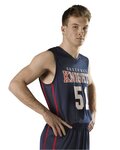 - Two contrast knit overlaid 1" stripes from armhole openings, down to bottom hem