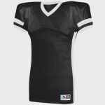 - Collegiate cut set-in sleeves with elastic cuffs for secure fit over pads