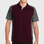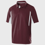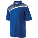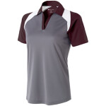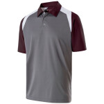 100% polyester with essortex moisture management performance fabric. Contrast, textured jacquard front panel insets with piping detail on sleeves and front. Modified self-fabric v-neck. Double-needle hems.