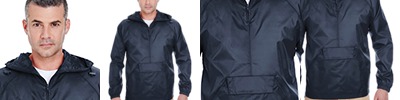 2 oz., 100% nylon; Water- and wind-resistant; Snorkel drawstring hood and bottom with barrel stoppers; Elastic cuffs; Packs into flap front pouch pocket;